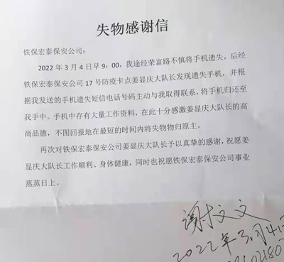 我司鐵保宏泰深圳保安公司安保員姜顯慶隊(duì)長(zhǎng)在防疫卡點(diǎn)拾到手機(jī)一臺(tái)。失主特致信表示感謝。